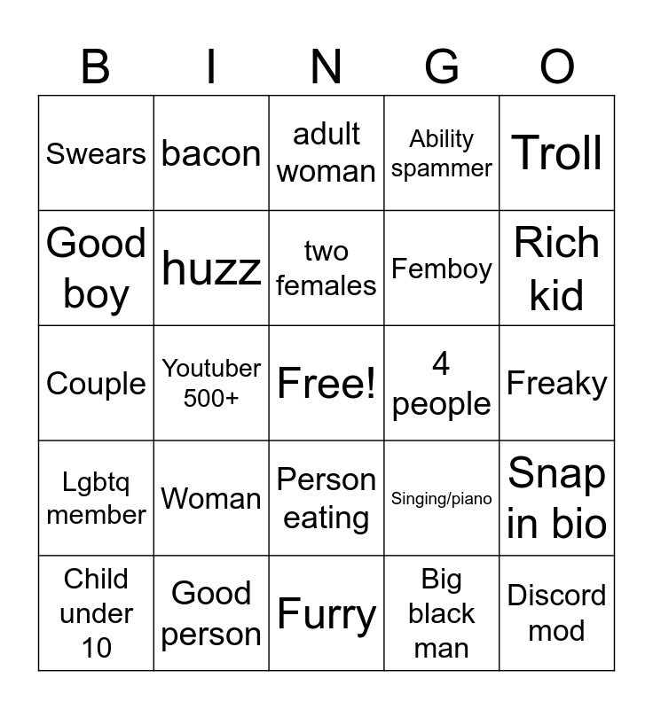 This bingo card has a free space and 24 words: Child under 10, Woman, two females, Big black man, Troll, Swears, bacon, adult woman, 4 people, Freaky, Couple, huzz, Singing/piano, Snap in bio, Good boy, Good person, Furry, Ability spammer, Rich kid, Lgbtq member, Youtuber 500+, Person eating, Femboy and Discord mod.