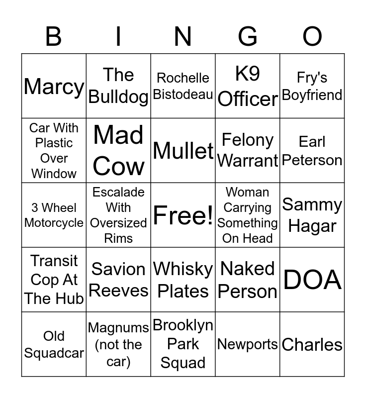 This bingo card has a free space and 24 words: Savion Reeves, Magnums (not the car), Mullet, Old Squadcar, Fry's Boyfriend, Marcy, Car With Plastic Over Window, The Bulldog, Woman Carrying Something On Head, Whisky Plates, Felony Warrant, 3 Wheel Motorcycle, Naked Person, DOA, Mad Cow, Newports, Sammy Hagar, Rochelle Bistodeau, Earl Peterson, Escalade With Oversized Rims, Charles, Transit Cop At The Hub, K9 Officer and Brooklyn Park Squad.