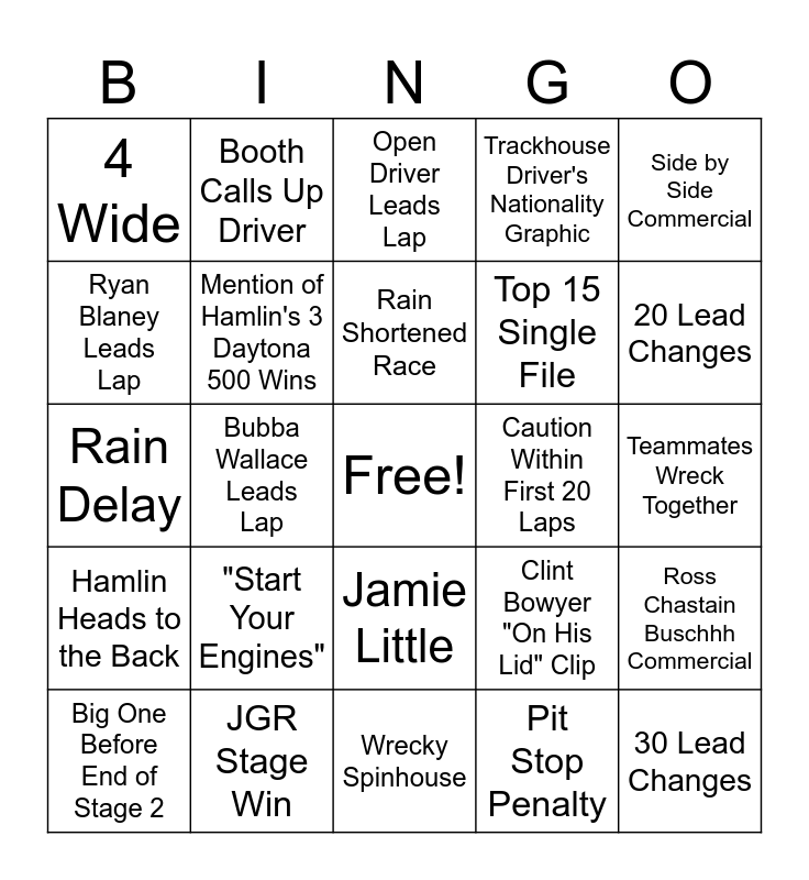 This bingo card has a free space and 49 words: Pass Thru Penalty, 30 Lead Changes, Kyle Busch Leads Lap, Wrecky Spinhouse, "Start Your Engines", "Boogity Boogity Boogity", Booth Calls Up Driver, Weather Radar, Ryan Blaney Leads Lap, RFK Stage Win, Mention of Hamlin's 3 Daytona 500 Wins, Trackhouse Driver's Nationality Graphic, Ross Chastain Buschhh Commercial, Clint Bowyer "On His Lid" Clip, Larry Mac's "Trends", Teammates 1 - 2 - 3, Rain Shortened Race, Caution Within First 20 Laps, "Crank It Up", Side by Side Commercial, Bubba Wallace Leads Lap, Pit Stop Penalty, 4 Wide, Top 15 Single File, Logano Block, 20 Lead Changes, Big One Before End of Stage 2, Earnhardt 1998 Daytona 500 Win, Jamie Little, Hamlin Heads to the Back, Chase Elliott Leads Lap, Caution Free Stage, Sunday Night Race, Monday Race, JGR Stage Win, "Thanks Larry" Mike Joy, "Hot Rod" Clint Bowyer, "Four Fresh Tires" Larry Mac, Teammates Wreck Together, Hendrick Stage Win, FLIP, 10 Lead Changes, Caution Before End of Stage 1, Penske Stage Win, Rain Delay, Open Driver Leads Lap, Red Flag, Debris Caution and Joey Logano Complains.