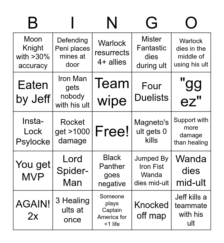 This bingo card has a free space and 24 words: Lord Spider-Man, 3 Healing ults at once, Team wipe, AGAIN! 2x, Warlock dies in the middle of using his ult, Moon Knight with >30% accuracy, Eaten by Jeff, Defending Peni places mines at door, Magneto's ult gets 0 kills, Black Panther goes negative, Four Duelists, Insta-Lock Psylocke, Jumped By Iron Fist Wanda dies mid-ult, Wanda dies mid-ult, Iron Man gets nobody with his ult, Knocked off map, Support with more damage than healing, Warlock resurrects 4+ allies, "gg ez", Rocket get >1000 damage, Jeff kills a teammate with his ult, You get MVP, Mister Fantastic dies during ult and Someone plays Captain America for <1 life.