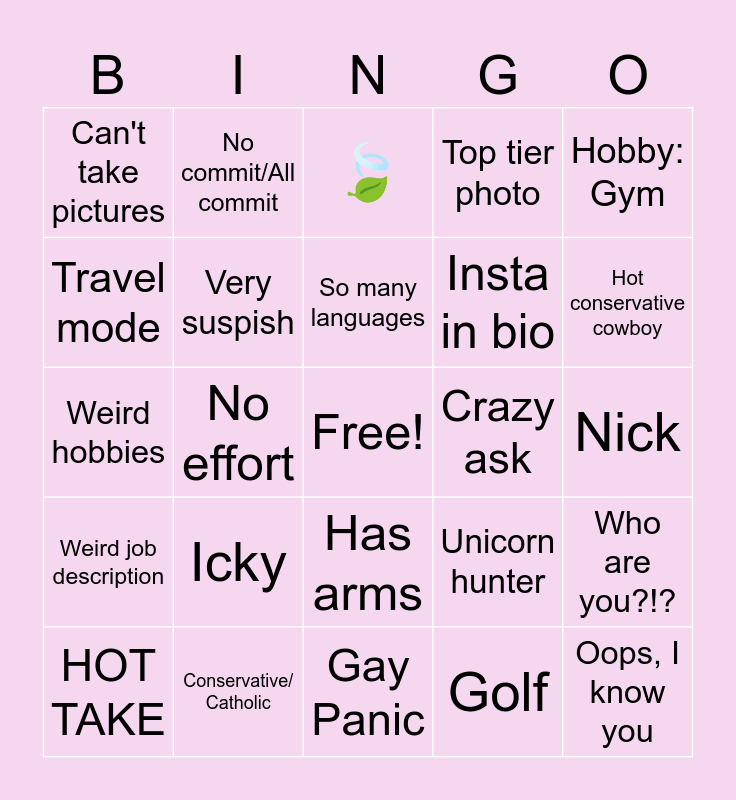 This bingo card has a free space and 26 words: Has arms, Golf, So many languages, Conservative/ Catholic, Hobby: Gym, Can't take pictures, Travel mode, No commit/All commit, Nick, Unicorn hunter, Insta in bio, Weird hobbies, Who are you?!?, HOT TAKE, No effort, Short king, Top tier photo, Weird job description, 🍃, Oops, I know you, Hot conservative cowboy, Gay Panic, Crazy ask, Icky, Very suspish and Golden retriever energy.