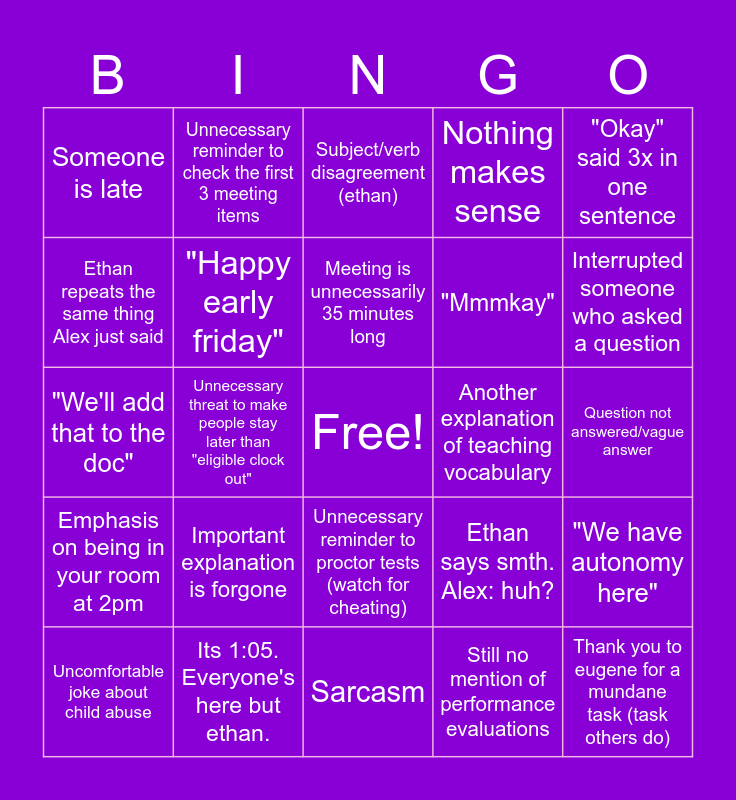 This bingo card has a free space and 24 words: Important explanation is forgone, Its 1:05. Everyone's here but ethan., Meeting is unnecessarily 35 minutes long, Uncomfortable joke about child abuse, "Okay" said 3x in one sentence, Someone is late, Ethan repeats the same thing Alex just said, Unnecessary reminder to check the first 3 meeting items, Another explanation of teaching vocabulary, Unnecessary reminder to proctor tests (watch for cheating), "Mmmkay", "We'll add that to the doc", Ethan says smth. Alex: huh?, "We have autonomy here", "Happy early friday", Still no mention of performance evaluations, Question not answered/vague answer, Subject/verb disagreement (ethan), Interrupted someone who asked a question, Unnecessary threat to make people stay later than "eligible clock out", Thank you to eugene for a mundane task (task others do), Emphasis on being in your room at 2pm, Nothing makes sense and Sarcasm.