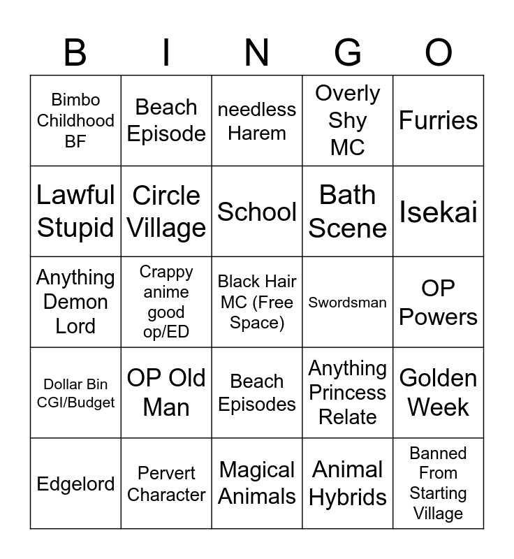 This bingo card has a free space and 24 words: Edgelord, OP Old Man, School, Animal Hybrids, Furries, Bimbo Childhood BF, Beach Episode, needless Harem, Swordsman, OP Powers, Anything Demon Lord, Circle Village, Anything Princess Relate, Golden Week, Lawful Stupid, Pervert Character, Magical Animals, Overly Shy MC, Isekai, Dollar Bin CGI/Budget, Crappy anime good op/ED, Beach Episodes, Bath Scene and Banned From Starting Village.