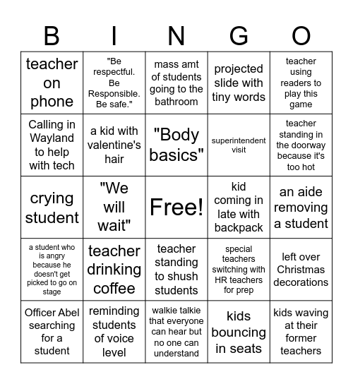This bingo card has a free space and 30 words: reminding students of voice level, student wearing noise cancelling headphones, "We will wait", teacher on laptop, teacher on phone, mass amt of students going to the bathroom, a kid with valentine's hair, teacher standing to shush students, kid coming in late with backpack, walkie talkie that everyone can hear but no one can understand, an aide removing a student, kids waving at their former teachers, kids bouncing in seats, teacher trying to figure our auditorium seating chart, teacher standing in the doorway because it's too hot, the "good kid" desperately trying to quiet classmates with the quiet sign, special teachers switching with HR teachers for prep, a student who is angry because he doesn't get picked to go on stage, teacher drinking coffee, teacher using readers to play this game, crying student, a student wearing a winter coat, "Be respectful. Be Responsible. Be safe.", superintendent visit, Calling in Wayland to help with tech, projected slide with tiny words, left over Christmas decorations, Officer Abel searching for a student, "Body basics" and "tickets".