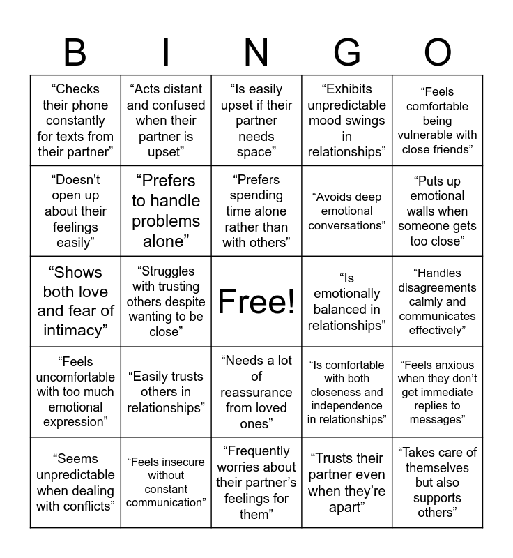 This bingo card has a free space and 25 words: “Easily trusts others in relationships”, “Frequently worries about their partner’s feelings for them”, “Prefers spending time alone rather than with others”, “Seems unpredictable when dealing with conflicts”, “Feels comfortable being vulnerable with close friends”, “Checks their phone constantly for texts from their partner”, “Doesn't open up about their feelings easily”, “Acts distant and confused when their partner is upset”, “Is emotionally balanced in relationships”, “Needs a lot of reassurance from loved ones”, “Avoids deep emotional conversations”, “Shows both love and fear of intimacy”, “Is comfortable with both closeness and independence in relationships”, “Feels anxious when they don’t get immediate replies to messages”, “Prefers to handle problems alone”, “Has trouble making decisions about relationships”, “Handles disagreements calmly and communicates effectively”, “Is easily upset if their partner needs space”, “Puts up emotional walls when someone gets too close”, “Struggles with trusting others despite wanting to be close”, “Takes care of themselves but also supports others”, “Feels insecure without constant communication”, “Feels uncomfortable with too much emotional expression”, “Exhibits unpredictable mood swings in relationships” and “Trusts their partner even when they’re apart”.