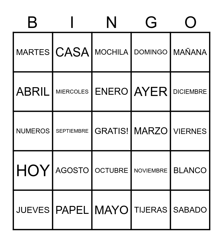 This bingo card has a free space and 39 words: FEBRERO, HOLA, ADIOS, MIERCOLES, JUEVES, OCTUBRE, ENERO, LUNES, MAÑANA, HOY, SEPTIEMBRE, DOMINGO, SABADO, VIERNES, MARZO, AGOSTO, JULIO, MARTES, JUNIO, NOVIEMBRE, ABRIL, MAYO, AYER, DICIEMBRE, ANTE AYER, TRES, SEIS, OCHO, NUEVE, CASA, SILLA, MESA, MOCHILA, PAPEL, TIJERAS, AZUL, BLANCO, NUMEROS and TELEFONO.