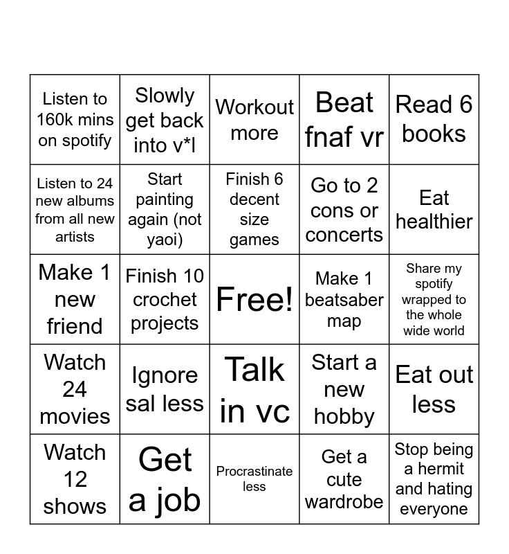 This bingo card has a free space and 24 words: Ignore sal less, Get a job, Finish 6 decent size games, Watch 12 shows, Read 6 books, Listen to 160k mins on spotify, Listen to 24 new albums from all new artists, Slowly get back into v*l, Make 1 beatsaber map, Talk in vc, Go to 2 cons or concerts, Make 1 new friend, Start a new hobby, Eat out less, Start painting again (not yaoi), Get a cute wardrobe, Share my spotify wrapped to the whole wide world, Workout more, Eat healthier, Finish 10 crochet projects, Stop being a hermit and hating everyone, Watch 24 movies, Beat fnaf vr and Procrastinate less.