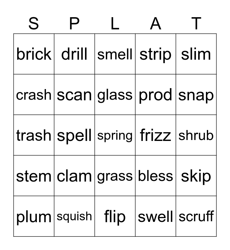 This bingo card has 25 words: clam, flip, glass, plum, slim, brick, crash, drill, frizz, grass, prod, trash, bless, skip, scan, scruff, shrub, smell, snap, spell, spring, squish, stem, strip and swell.