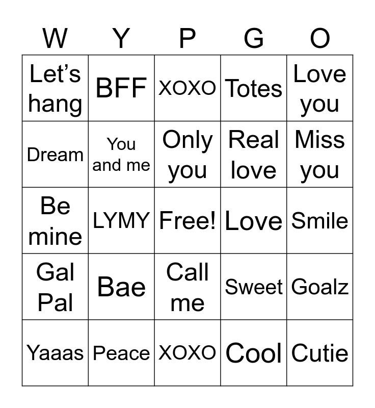 This bingo card has a free space and 24 words: Bae, Peace, Only you, Yaaas, Love you, Let’s hang, Dream, BFF, Love, Call me, Real love, Be mine, Sweet, Goalz, You and me, Cool, Smile, XOXO, Miss you, LYMY, Cutie, Gal Pal, Totes and XOXO.