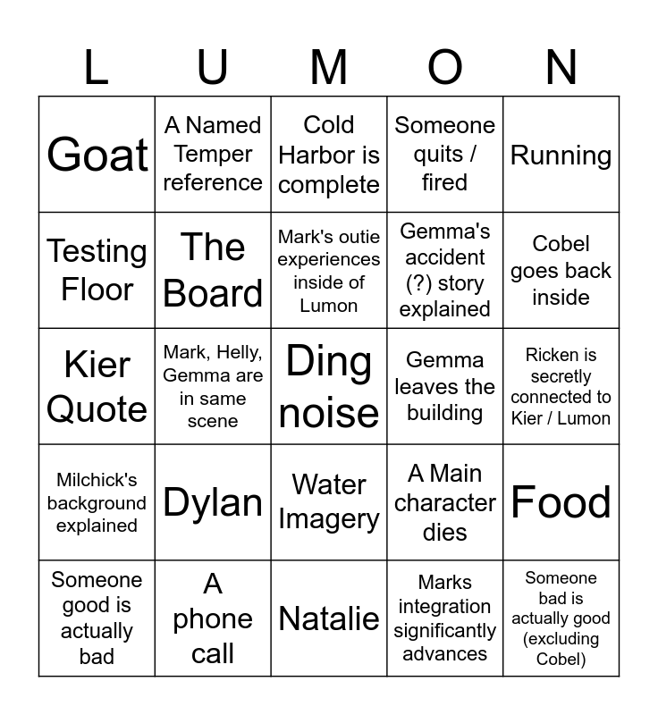 This bingo card has a free space and 24 words: Dylan, A phone call, Mark's outie experiences inside of Lumon, Someone good is actually bad, Running, Goat, Testing Floor, A Named Temper reference, Gemma leaves the building, Water Imagery, Gemma's accident (?) story explained, Kier Quote, A Main character dies, Food, The Board, Marks integration significantly advances, Ricken is secretly connected to Kier / Lumon, Cold Harbor is complete, Cobel goes back inside, Mark, Helly, Gemma are in same scene, Someone bad is actually good (excluding Cobel), Milchick's background explained, Someone quits / fired and Natalie.