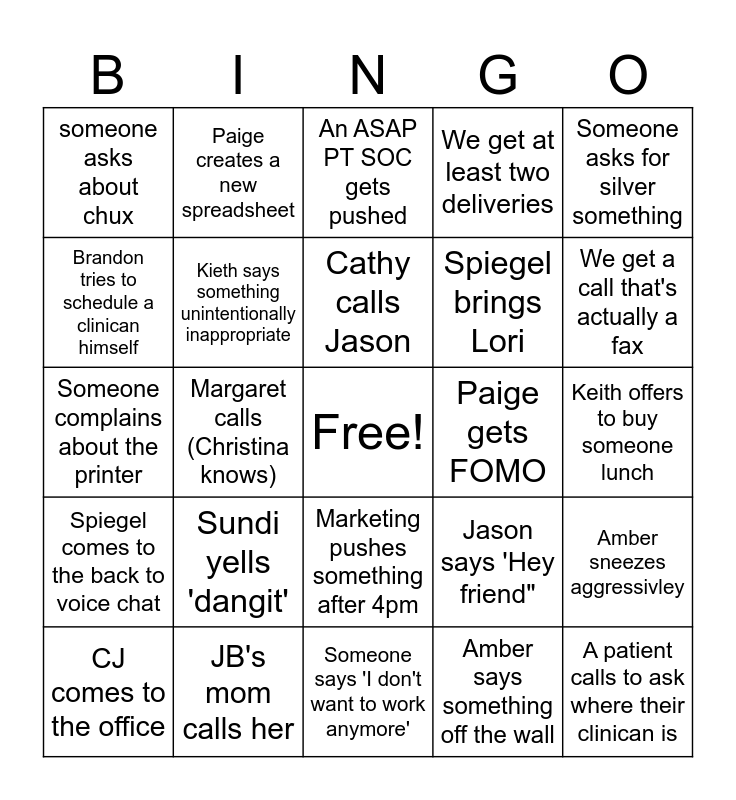 This bingo card has a free space and 24 words: Sundi yells 'dangit', JB's mom calls her, Cathy calls Jason, CJ comes to the office, Someone asks for silver something, someone asks about chux, Brandon tries to schedule a clinican himself, Paige creates a new spreadsheet, Paige gets FOMO, Marketing pushes something after 4pm, Spiegel brings Lori, Someone complains about the printer, Jason says 'Hey friend", Amber sneezes aggressivley, Kieth says something unintentionally inappropriate, Amber says something off the wall, Keith offers to buy someone lunch, An ASAP PT SOC gets pushed, We get a call that's actually a fax, Margaret calls (Christina knows), A patient calls to ask where their clinican is, Spiegel comes to the back to voice chat, We get at least two deliveries and Someone says 'I don't want to work anymore'.