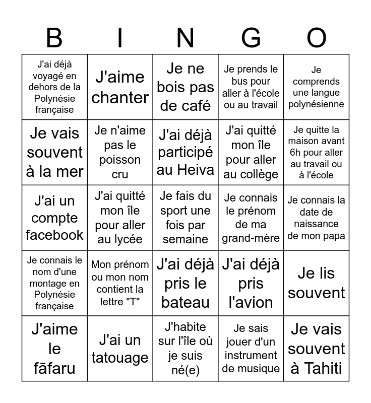 This bingo card has a free space and 24 words: J'aime le fāfaru, Mon prénom ou mon nom contient la lettre "T", J'ai déjà participé au Heiva, Je sais jouer d'un instrument de musique, Je comprends une langue polynésienne, J'ai déjà voyagé en dehors de la Polynésie française, J'aime chanter, Je ne bois pas de café, Je connais le prénom de ma grand-mère, Je connais la date de naissance de mon papa, J'ai un compte facebook, Je n'aime pas le poisson cru, J'ai déjà pris l'avion, Je lis souvent, Je vais souvent à la mer, J'ai un tatouage, J'habite sur l'île où je suis né(e), Je prends le bus pour aller à l'école ou au travail, Je quitte la maison avant 6h pour aller au travail ou à l'école, Je connais le nom d'une montage en Polynésie française, J'ai quitté mon île pour aller au lycée, J'ai déjà pris le bateau, J'ai quitté mon île pour aller au collège and Je vais souvent à Tahiti.