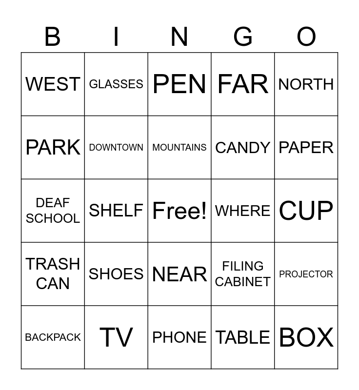 This bingo card has a free space and 35 words: LIVE, HERE, AREA, DOWNTOWN, NEAR, FAR, PARK, HILLS, MOUNTAINS, SHOPPING, DEAF SCHOOL, NORTH, EAST, SOUTH, WEST, WHERE, TABLE, SHELF, TRASH CAN, BOX, FILING CABINET, BACKPACK, PROJECTOR, TV, PEN, PAPER, BOOK, APPLE, CANDY, CUP, PICTURE FRAME, PHONE, SHOES, GLASSES and LAPTOP.