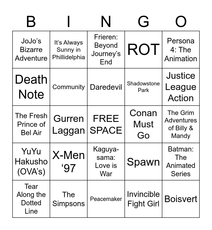 This bingo card has a free space and 24 words: X-Men ‘97, The Simpsons, Daredevil, Tear Along the Dotted Line, Persona 4: The Animation, JoJo’s Bizarre Adventure, Death Note, It’s Always Sunny in Phillidelphia, Conan Must Go, Kaguya-sama: Love is War, Shadowstone Park, The Fresh Prince of Bel Air, Spawn, Batman: The Animated Series, Community, Invincible Fight Girl, The Grim Adventures of Billy & Mandy, Frieren: Beyond Journey’s End, Justice League Action, Gurren Laggan, Boisvert, YuYu Hakusho (OVA’s), ROT and Peacemaker.
