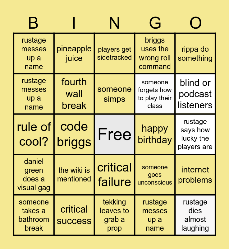 ⚠ This card has duplicate items: someone simps (2), the wiki is mentioned (2), internet problems (2), rustage messes up a name (3), blind or podcast listeners (2), someone forgets something from the last episode (2), pineapple juice (2), reference to a different campaign (2), someone forgets how to play their class (2), rustage dies almost laughing (2), rule of cool? (2), fourth wall break (2), someone goes unconscious (2), rustage says how lucky the players are (2), critical success (2), critical failure (2), players get sidetracked (2), happy birthday (2), someone takes a bathroom break (2), code briggs (2), tekking leaves to grab a prop (2), briggs uses the wrong roll command (2), rippa do something (2), daniel green does a visual gag (2), shwabadi is the voice of reason (2)