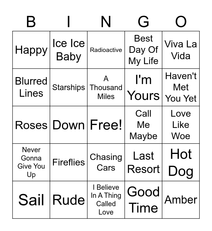 This bingo card has a free space and 24 words: Fireflies, Rude, A Thousand Miles, Sail, Viva La Vida, Happy, Blurred Lines, Ice Ice Baby, Call Me Maybe, Chasing Cars, I'm Yours, Roses, Last Resort, Hot Dog, Starships, Good Time, Love Like Woe, Radioactive, Haven't Met You Yet, Down, Amber, Never Gonna Give You Up, Best Day Of My Life and I Believe In A Thing Called Love.