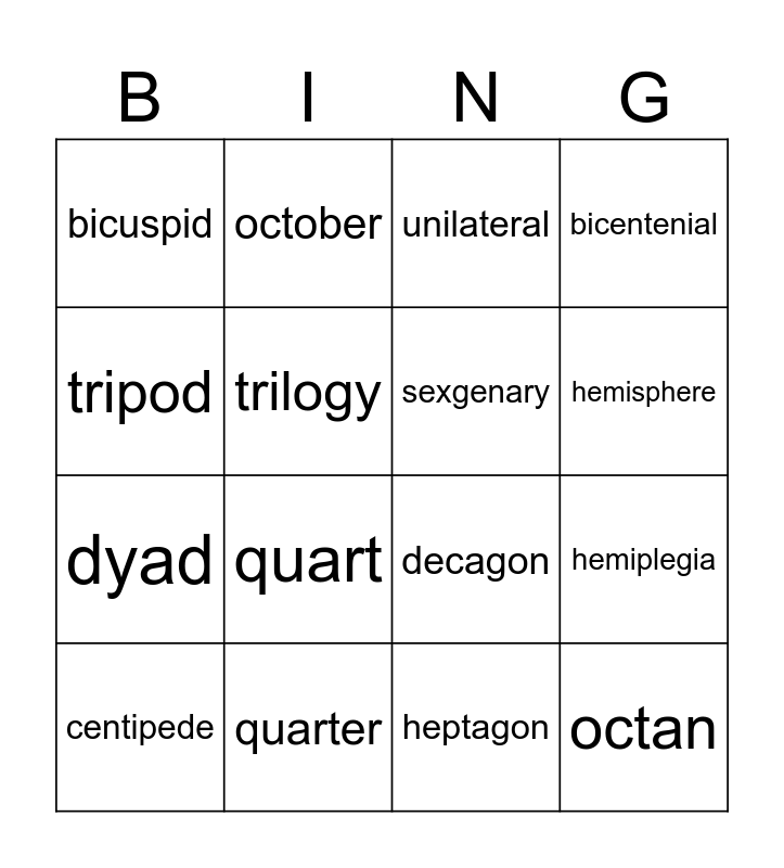 This bingo card has 16 words: quarter, hemiplegia, unilateral, bicuspid, dyad, october, decagon, heptagon, tripod, trilogy, centipede, bicentenial, quart, hemisphere, sexgenary and octan.