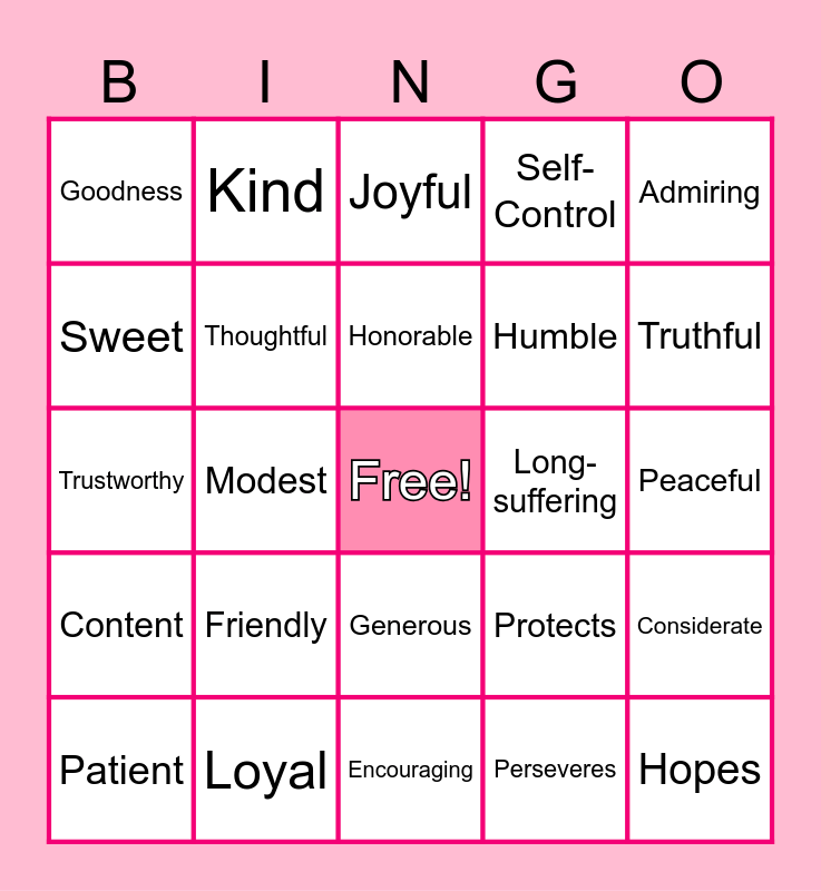 This bingo card has a free space and 24 words: Friendly, Loyal, Honorable, Patient, Admiring, Goodness, Sweet, Kind, Long-suffering, Generous, Humble, Trustworthy, Protects, Considerate, Thoughtful, Perseveres, Peaceful, Joyful, Truthful, Modest, Hopes, Content, Self-Control and Encouraging.