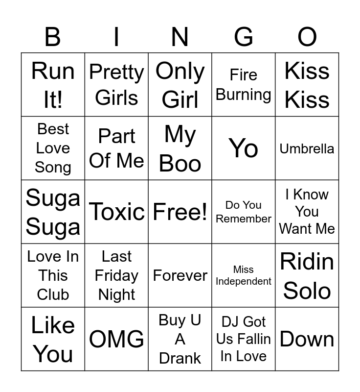This bingo card has a free space and 25 words: Last Friday Night, Buy U A Drank, My Boo, Like You, Kiss Kiss, Run It!, Best Love Song, Pretty Girls, Do You Remember, Forever, Yo, Suga Suga, Miss Independent, Ridin Solo, Part Of Me, Temperature, I Know You Want Me, Only Girl, Umbrella, Toxic, Down, OMG, Love In This Club, Fire Burning and DJ Got Us Fallin In Love.