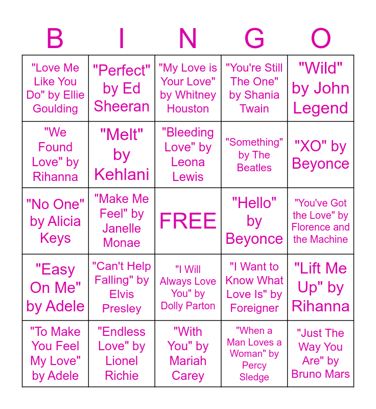 This bingo card has a free space and 24 words: "Can't Help Falling" by Elvis Presley, "Endless Love" by Lionel Richie, "Bleeding Love" by Leona Lewis, "To Make You Feel My Love" by Adele, "Wild" by John Legend, "Love Me Like You Do" by Ellie Goulding, "We Found Love" by Rihanna, "Perfect" by Ed Sheeran, "Hello" by Beyonce, "I Will Always Love You" by Dolly Parton, "Something" by The Beatles, "No One" by Alicia Keys, "I Want to Know What Love Is" by Foreigner, "Lift Me Up" by Rihanna, "Melt" by Kehlani, "When a Man Loves a Woman" by Percy Sledge, "You've Got the Love" by Florence and the Machine, "My Love is Your Love" by Whitney Houston, "XO" by Beyonce, "Make Me Feel" by Janelle Monae, "Just The Way You Are" by Bruno Mars, "Easy On Me" by Adele, "You're Still The One" by Shania Twain and "With You" by Mariah Carey.