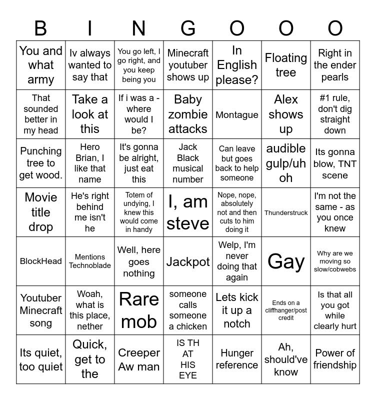 This bingo card has a free space and 48 words: BlockHead, He's right behind me isn't he, Creeper Aw man, Jackpot, Montague, Thunderstruck, Right in the ender pearls, Its quiet, too quiet, Hero Brian, I like that name, Totem of undying, I knew this would come in handy, Minecraft youtuber shows up, In English please?, audible gulp/uh oh, Its gonna blow, TNT scene, Movie title drop, Woah, what is this place, nether, You go left, I go right, and you keep being you, Jack Black musical number, Lets kick it up a notch, Floating tree, #1 rule, don't dig straight down, That sounded better in my head, Iv always wanted to say that, If i was a - where would I be?, Hunger reference, Alex shows up, I'm not the same - as you once knew, Youtuber Minecraft song, Mentions Technoblade, It's gonna be alright, just eat this, someone calls someone a chicken, Can leave but goes back to help someone, Ends on a cliffhanger/post credit, Is that all you got while clearly hurt, You and what army, Quick, get to the, Well, here goes nothing, IS THAT HIS EYE, Nope, nope, absolutely not and then cuts to him doing it, Ah, should've know, Why are we moving so slow/cobwebs, Punching tree to get wood., Take a look at this, Rare mob, Baby zombie attacks, Welp, I'm never doing that again, Gay and Power of friendship.