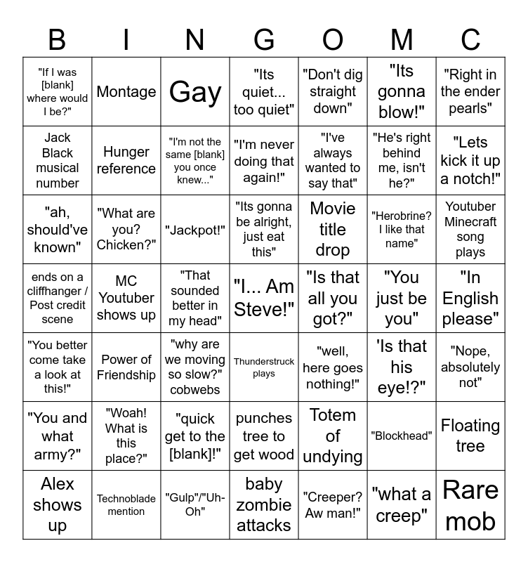 This bingo card has a free space and 49 words: "Blockhead", "He's right behind me, isn't he?", "Creeper? Aw man!", MC Youtuber shows up, "Jackpot!", "In English please", Montage, "Gulp"/"Uh-Oh", "Its gonna blow!", Thunderstruck plays, "Right in the ender pearls", "Its quiet... too quiet", "Herobrine? I like that name", Movie title drop, "Woah! What is this place?", "You just be you", Jack Black musical number, "Lets kick it up a notch!", Floating tree, "Don't dig straight down", "I've always wanted to say that", "That sounded better in my head", "If I was [blank] where would I be?", Hunger reference, Alex shows up, "I'm not the same [blank] you once knew...", Youtuber Minecraft song plays, Technoblade mention, "Its gonna be alright, just eat this", "What are you? Chicken?", Can leave but goes back to help someone, "Is that all you got?", "You and what army?", "quick get to the [blank]!", ends on a cliffhanger / Post credit scene, "well, here goes nothing!", 'Is that his eye!?", "Nope, absolutely not", "ah, should've known", "why are we moving so slow?" cobwebs, punches tree to get wood, "You better come take a look at this!", Rare mob, baby zombie attacks, "I'm never doing that again!", Gay, Totem of undying, Power of Friendship and "what a creep".