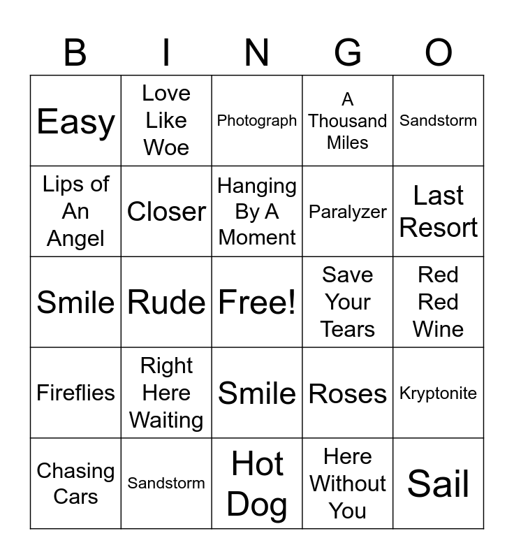 This bingo card has a free space and 40 words: Drift Away, Smile, Hanging By A Moment, Closer, Sandstorm, Smile, Hanging By A Moment, Closer, Sandstorm, Fireflies, Rude, A Thousand Miles, Sail, Red Red Wine, Save Your Tears, Right Here Waiting, The Promise, Easy, Rockstar, Photograph, Kryptonite, Here Without You, Paralyzer, Lips of An Angel, Easy Lover, Hold The Line, Torn, With Or Without You, 50 Ways To Leave Your Lover, Lovely Day, Call Me Maybe, Chasing Cars, I'm Yours, Roses, Last Resort, Hot Dog, Starships, Good Time, Love Like Woe and Radioactive.
