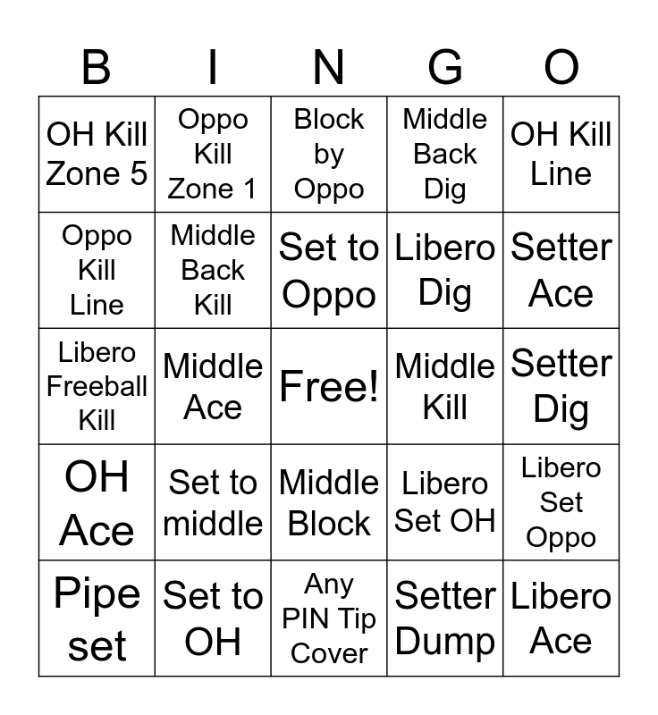 This bingo card has a free space and 24 words: Set to middle, Set to OH, Set to Oppo, Pipe set, OH Kill Line, OH Kill Zone 5, Oppo Kill Line, Oppo Kill Zone 1, Middle Kill, Middle Block, Libero Dig, Libero Freeball Kill, Libero Set OH, Libero Set Oppo, Middle Back Kill, Setter Dump, Setter Dig, Block by Oppo, Setter Ace, Middle Ace, Libero Ace, OH Ace, Middle Back Dig and Any PIN Tip Cover.