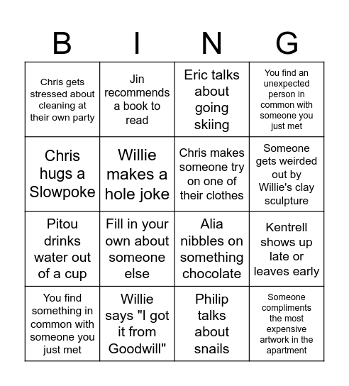 This bingo card has 16 words: Willie says "I got it from Goodwill", Kentrell shows up late or leaves early, Eric talks about going skiing, Chris gets stressed about cleaning at their own party, Pitou drinks water out of a cup, Jin recommends a book to read, Alia nibbles on something chocolate, Philip talks about snails, Chris hugs a Slowpoke, Willie makes a hole joke, You find something in common with someone you just met, You find an unexpected person in common with someone you just met, Fill in your own about someone else, Someone gets weirded out by Willie's clay sculpture, Chris makes someone try on one of their clothes and Someone compliments the most expensive artwork in the apartment.