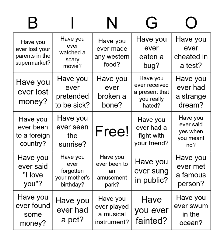 This bingo card has a free space and 24 words: Have you ever forgotten your mother's birthday?, Have you ever had a pet?, Have you ever broken a bone?, Have you ever found some money?, Have you ever cheated in a test?, Have you ever lost your parents in the supermarket?, Have you ever lost money?, Have you ever watched a scary movie?, Have you ever had a fight with your friend?, Have you ever been to an amusement park?, Have you ever received a present that you really hated?, Have you ever been to a foreign country?, Have you ever sung in public?, Have you ever met a famous person?, Have you ever pretended to be sick?, Have you ever fainted?, Have you ever said yes when you meant no?, Have you ever made any western food?, Have you ever had a strange dream?, Have you ever seen the sunrise?, Have you ever swum in the ocean?, Have you ever said "I love you"?, Have you ever eaten a bug? and Have you ever played a musical instrument?.