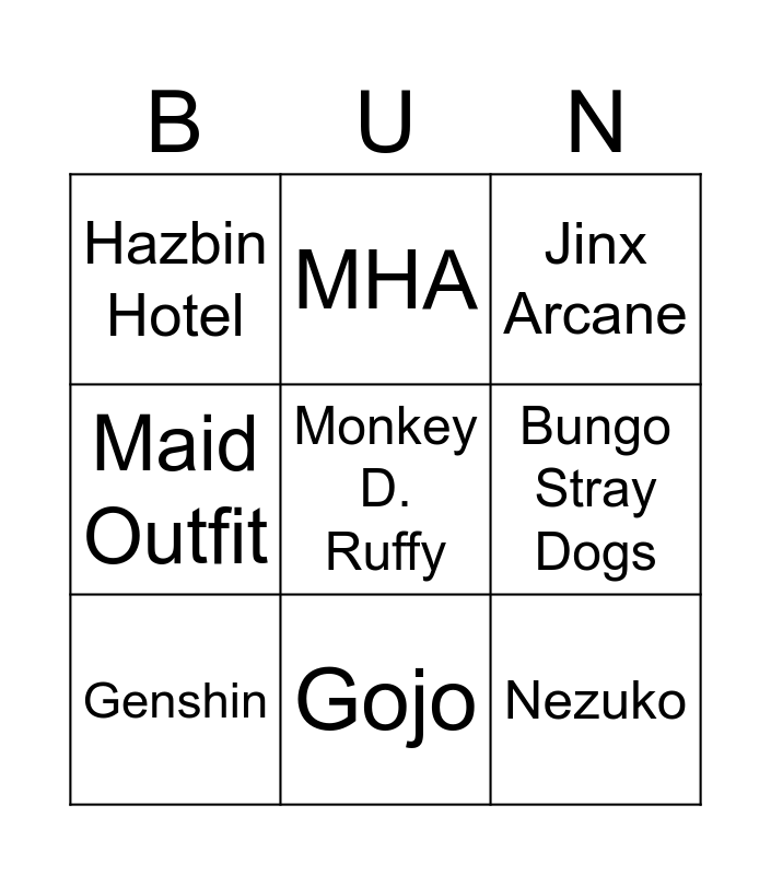 This bingo card has a free space and 8 words: Bungo Stray Dogs, Jinx Arcane, MHA, Genshin, Hazbin Hotel, Nezuko, Maid Outfit and Gojo.