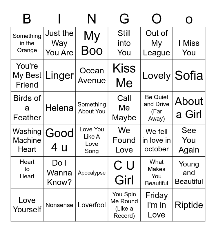 This bingo card has 45 words: APT., Birds of a Feather, Good Luck, Babe, Love You Like A Love Song, C U Girl, See You Again, My Boo, Thinkin Bout You, Out of My League, We Found Love, Still into You, Helena, About a Girl, Be Quiet and Drive (Far Away), You Spin Me Round (Like a Record), We fell in love in october, Young and Beautiful, Lovely, Free!, Kiss Me, Just the Way You Are, Love Yourself, What Makes You Beautiful, Something in the Orange, Open Arms, Something About You, Do I Wanna Know?, Lovers Rock, Washing Machine Heart, Call Me Maybe, Everlong, Good 4 u, Loverfool, Friday I'm in Love, Nonsense, Sofia, Apocalypse, Riptide, Heart to Heart, Linger, I Miss You, Ocean Avenue, I Believe in a Thing Called Love, You're My Best Friend and Home.