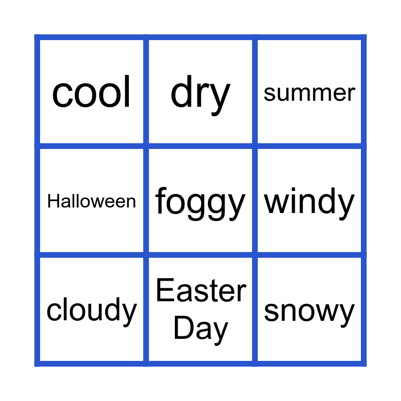 This bingo card has 21 words: hot, cold, summer, autumn, Valentine's Day, Mary Christmas, cool, dry, wet, cloudy, foggy, windy, rainy, stormy, snowy, warm, spring, winter, Halloween, Easter Day and Happy New Year.
