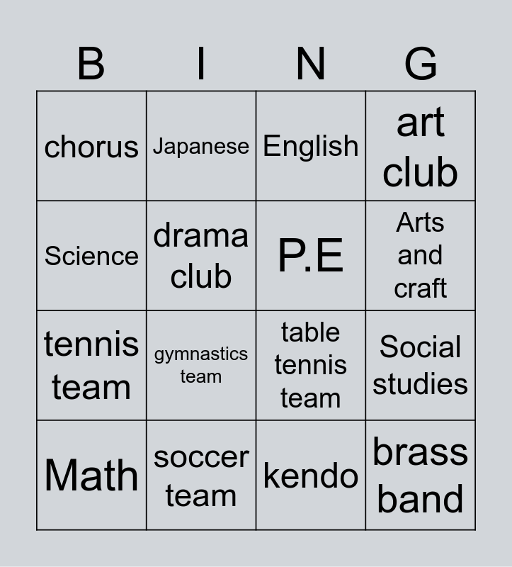 This bingo card has 24 words: music, badminton team, Arts and craft, basketball team, Science, chorus, drama club, Japanese, soccer team, softball team, tennis team, table tennis team, track and field team, volleyball team, P.E, swimming club, kendo, English, gymnastics team, Social studies, Math, brass band, art club and baseball team.