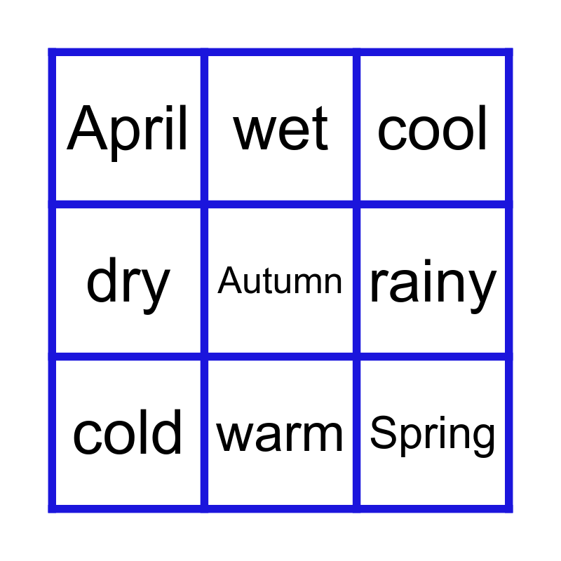 This bingo card has 16 words: Free!, cold, Autumn, cool, dry, wet, cloudy, foggy, windy, rainy, stormy, warm, Spring, April, July and November.
