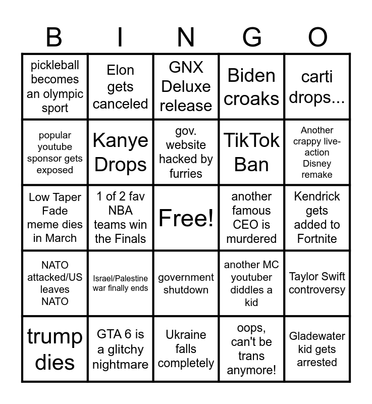 This bingo card has a free space and 24 words: Israel/Palestine war finally ends, GTA 6 is a glitchy nightmare, gov. website hacked by furries, trump dies, carti drops..., pickleball becomes an olympic sport, popular youtube sponsor gets exposed, Elon gets canceled, another famous CEO is murdered, government shutdown, TikTok Ban, Low Taper Fade meme dies in March, another MC youtuber diddles a kid, Taylor Swift controversy, Kanye Drops, oops, can't be trans anymore!, Kendrick gets added to Fortnite, GNX Deluxe release, Another crappy live-action Disney remake, 1 of 2 fav NBA teams win the Finals, Gladewater kid gets arrested, NATO attacked/US leaves NATO, Biden croaks and Ukraine falls completely.