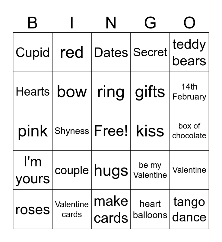 This bingo card has a free space and 24 words: couple, Valentine cards, ring, roses, teddy bears, Cupid, Hearts, red, kiss, hugs, gifts, pink, be my Valentine, Valentine, bow, heart balloons, box of chocolate, Dates, 14th February, Shyness, tango dance, I'm yours, Secret and make cards.