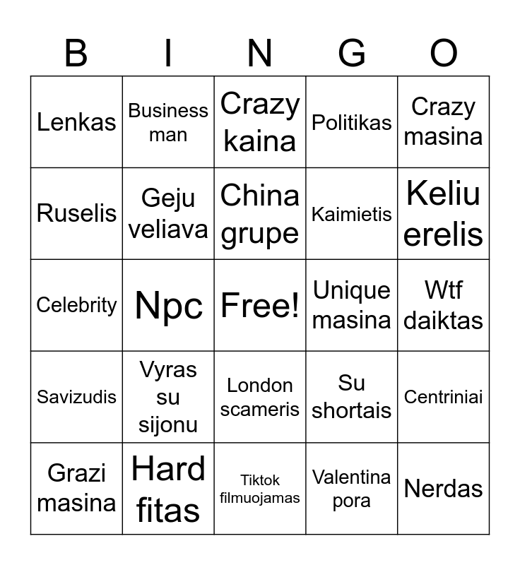 This bingo card has a free space and 24 words: Vyras su sijonu, Hard fitas, China grupe, Grazi masina, Crazy masina, Lenkas, Ruselis, Business man, Unique masina, London scameris, Kaimietis, Celebrity, Su shortais, Centriniai, Geju veliava, Valentina pora, Wtf daiktas, Crazy kaina, Keliu erelis, Npc, Nerdas, Savizudis, Politikas and Tiktok filmuojamas.