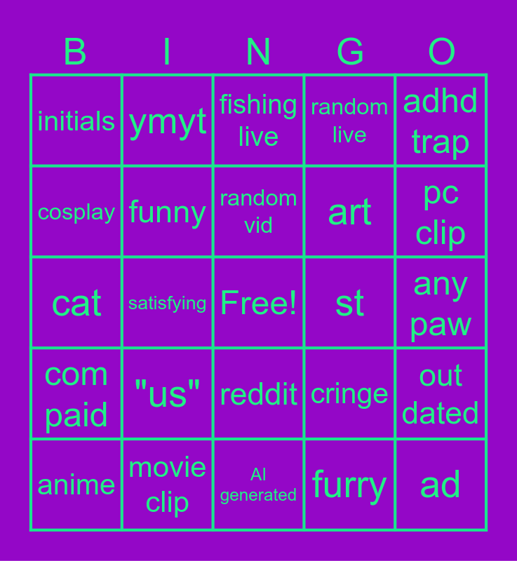 This bingo card has a free space and 24 words: "us", movie clip, random vid, anime, adhd trap, initials, cosplay, ymyt, st, reddit, art, cat, cringe, out dated, funny, furry, any paw, fishing live, pc clip, satisfying, ad, com paid, random live and AI generated.