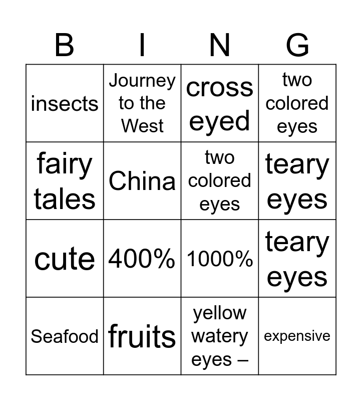 This bingo card has 20 words: teary eyes, watery eyes, cross eyed, Macaron rabbit, Seafood, fairy tales, fruits, insects, cute, Journey to the West, 400%, 1000%, China, expensive, two colored eyes, dora eyes, teary eyes, two colored eyes, yellow watery eyes – and Trendy.