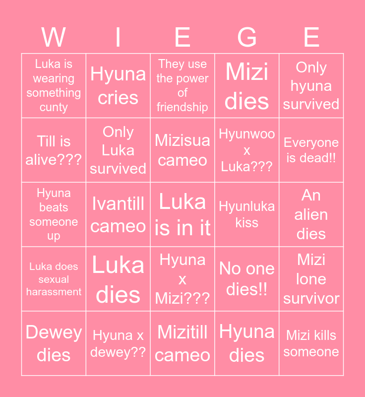 This bingo card has a free space and 24 words: Luka dies, Hyuna x dewey??, Mizisua cameo, Dewey dies, Only hyuna survived, Luka is wearing something cunty, Till is alive???, Hyuna cries, Hyunluka kiss, Hyuna x Mizi???, Hyunwoo x Luka???, Hyuna beats someone up, No one dies!!, Mizi lone survivor, Only Luka survived, Hyuna dies, An alien dies, They use the power of friendship, Everyone is dead!!, Ivantill cameo, Mizi kills someone, Luka does sexual harassment, Mizi dies and Mizitill cameo.