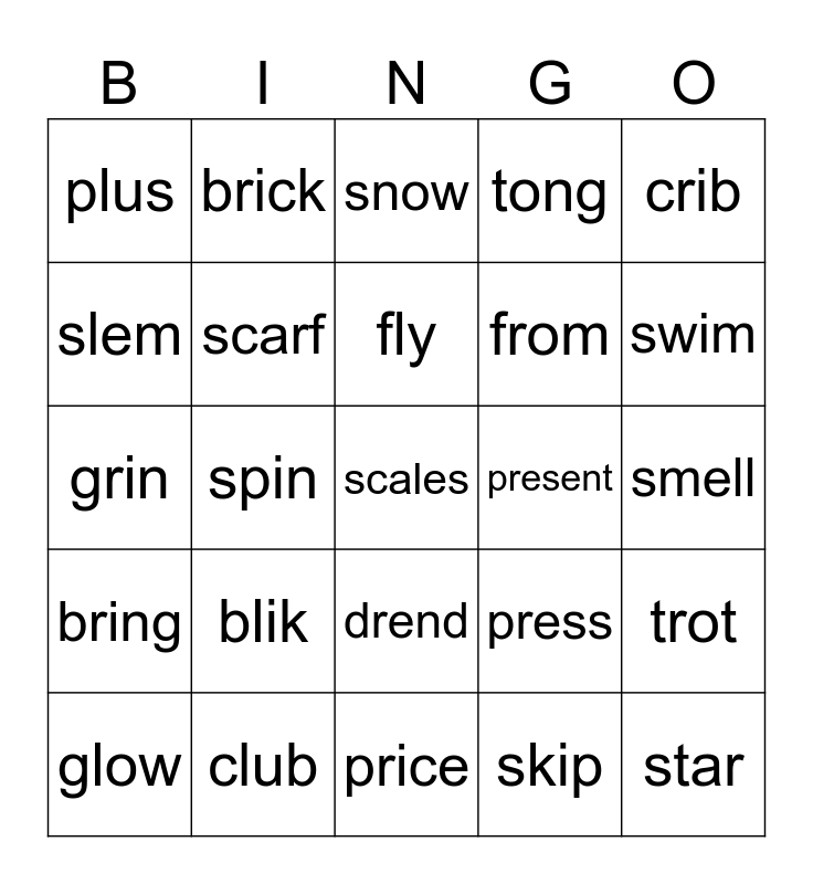 This bingo card has a free space and 24 words: blik, club, fly, glow, crib, plus, slem, brick, present, drend, from, grin, press, trot, scarf, skip, smell, snow, swim, spin, star, bring, tong and price.