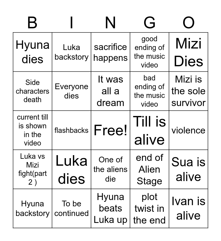This bingo card has a free space and 24 words: Luka dies, To be continued, It was all a dream, Hyuna backstory, Mizi Dies, Hyuna dies, Side characters death, Luka backstory, Till is alive, One of the aliens die, bad ending of the music video, current till is shown in the video, end of Alien Stage, Sua is alive, Everyone dies, plot twist in the end, violence, sacrifice happens, Mizi is the sole survivor, flashbacks, Ivan is alive, Luka vs Mizi fight(part 2 ), good ending of the music video and Hyuna beats Luka up.