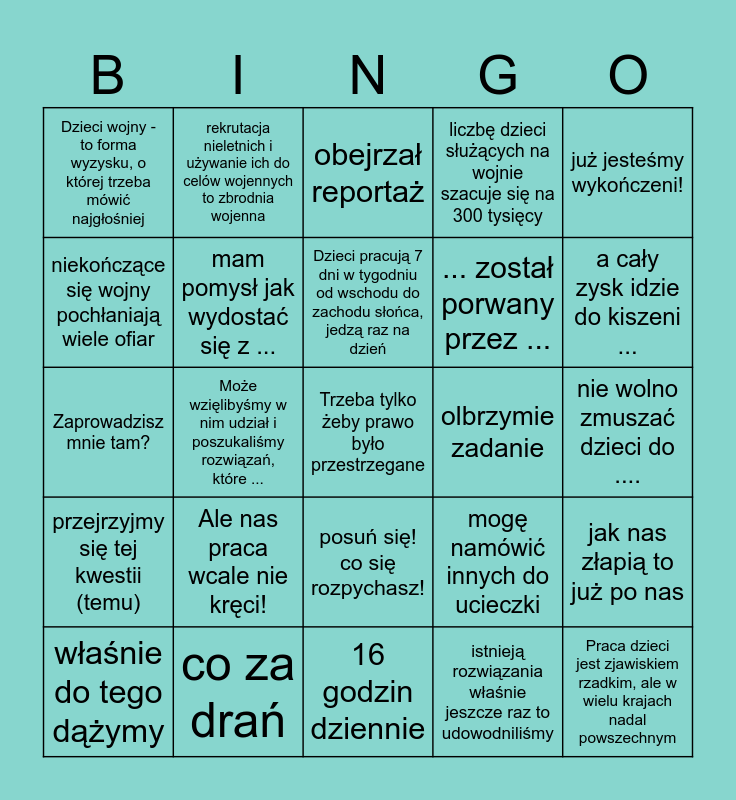 This bingo card has a free space and 24 words: Ale nas praca wcale nie kręci!, co za drań, Dzieci pracują 7 dni w tygodniu od wschodu do zachodu słońca, jedzą raz na dzień, właśnie do tego dążymy, już jesteśmy wykończeni!, Dzieci wojny - to forma wyzysku, o której trzeba mówić najgłośniej, niekończące się wojny pochłaniają wiele ofiar, rekrutacja nieletnich i używanie ich do celów wojennych to zbrodnia wojenna, olbrzymie zadanie, posuń się! co się rozpychasz!, ... został porwany przez ..., Zaprowadzisz mnie tam?, mogę namówić innych do ucieczki, jak nas złapią to już po nas, mam pomysł jak wydostać się z ..., istnieją rozwiązania właśnie jeszcze raz to udowodniliśmy, nie wolno zmuszać dzieci do ...., obejrzał reportaż, a cały zysk idzie do kiszeni ..., Może wzięlibyśmy w nim udział i poszukaliśmy rozwiązań, które ..., Praca dzieci jest zjawiskiem rzadkim, ale w wielu krajach nadal powszechnym, przejrzyjmy się tej kwestii (temu), liczbę dzieci służących na wojnie szacuje się na 300 tysięcy and 16 godzin dziennie.