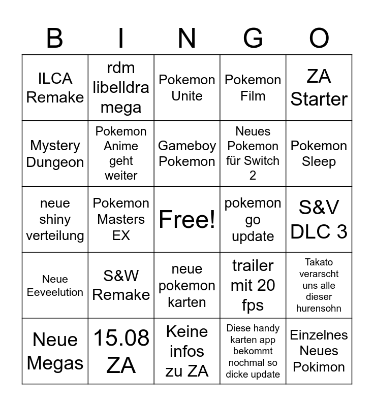 This bingo card has a free space and 24 words: S&W Remake, 15.08 ZA, Gameboy Pokemon, Neue Megas, ZA Starter, ILCA Remake, Mystery Dungeon, rdm libelldra mega, pokemon go update, neue pokemon karten, Neues Pokemon für Switch 2, neue shiny verteilung, trailer mit 20 fps, Takato verarscht uns alle dieser hurensohn, Pokemon Anime geht weiter, Diese handy karten app bekommt nochmal so dicke update, S&V DLC 3, Pokemon Unite, Pokemon Sleep, Pokemon Masters EX, Einzelnes Neues Pokimon, Neue Eeveelution, Pokemon Film and Keine infos zu ZA.