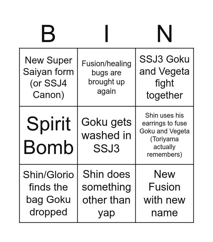 This bingo card has a free space and 8 words: Shin uses his earrings to fuse Goku and Vegeta (Toriyama actually remembers), SSJ3 Goku and Vegeta fight together, Fusion/healing bugs are brought up again, Shin/Glorio finds the bag Goku dropped, New Super Saiyan form (or SSJ4 Canon), New Fusion with new name, Spirit Bomb and Shin does something other than yap.