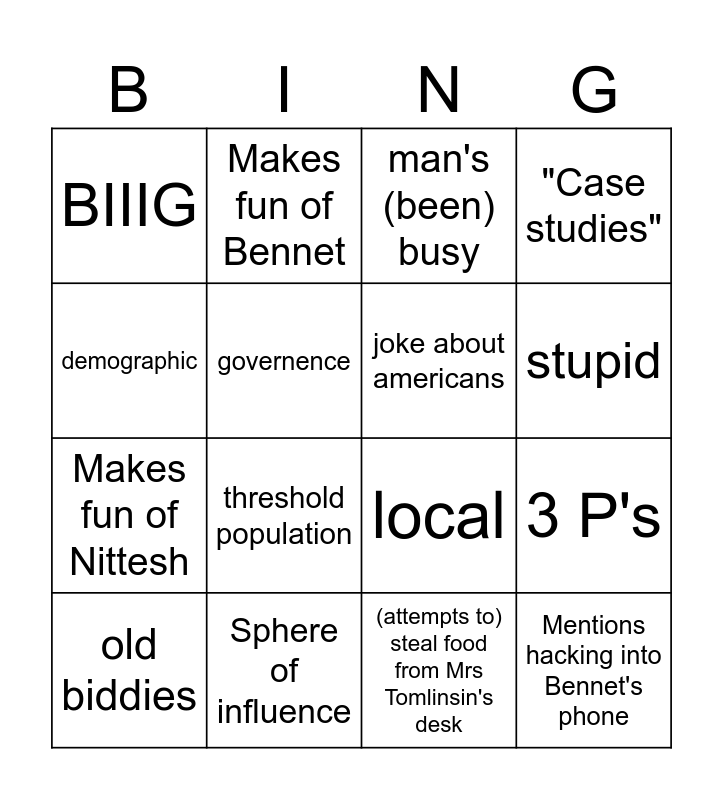 This bingo card has 21 words: Sphere of influence, Kacper!, Makes fun of Bennet, beer, (attempts to) steal food from Mrs Tomlinsin's desk, joke about americans, BIIIG, man's (been) busy, local, stupid, Makes fun of Nittesh, "Case studies", Mentions hacking into Bennet's phone, disposable income, governence, point and boo, old biddies, threshold population, demographic, 3 P's and IA.