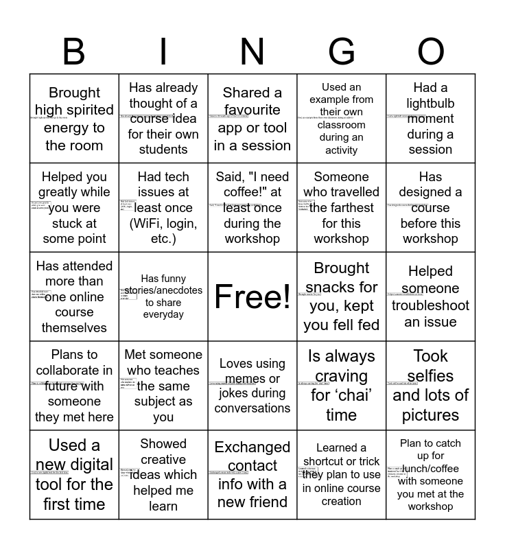 This bingo card has 24 images, a free space and 24 words: Met someone who teaches the same subject as you, Showed creative ideas which helped me learn, Said, "I need coffee!" at least once during the workshop, Used a new digital tool for the first time, Had a lightbulb moment during a session, Brought high spirited energy to the room, Helped you greatly while you were stuck at some point, Has already thought of a course idea for their own students, Brought snacks for you, kept you fell fed, Loves using memes or jokes during conversations, Someone who travelled the farthest for this workshop, Has attended more than one online course themselves, Is always craving for ‘chai’ time, Took selfies and lots of pictures, Had tech issues at least once (WiFi, login, etc.), Learned a shortcut or trick they plan to use in online course creation, Helped someone troubleshoot an issue, Shared a favourite app or tool in a session, Has designed a course before this workshop, Has funny stories/anecdotes to share everyday, Plan to catch up for lunch/coffee with someone you met at the workshop, Plans to collaborate in future with someone they met here, Used an example from their own classroom during an activity and Exchanged contact info with a new friend.