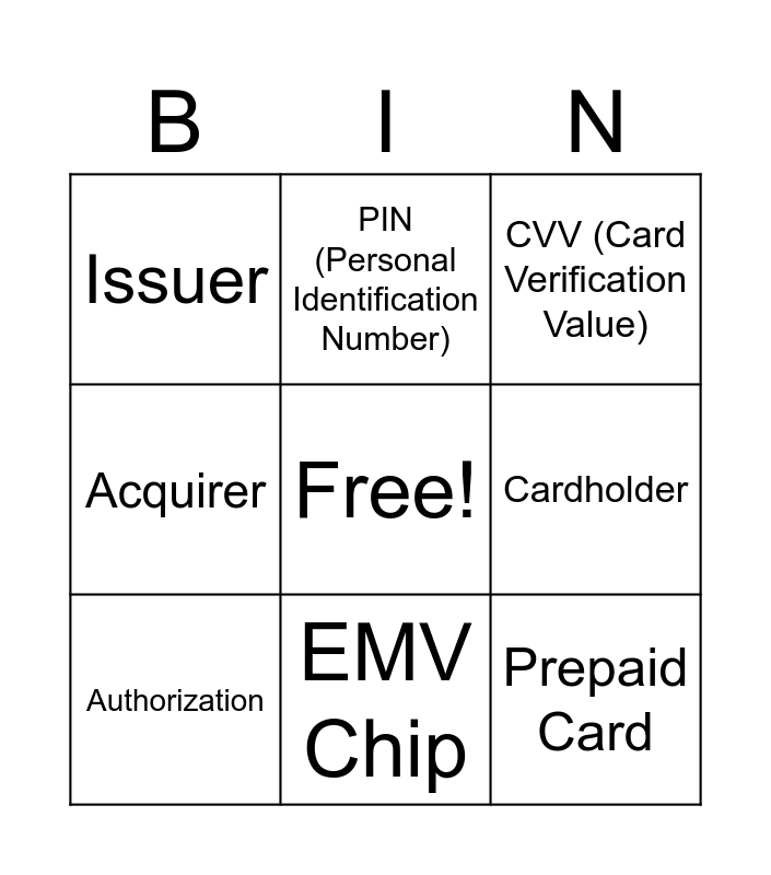 This bingo card has a free space and 12 words: Credit Card, Debit Card, Prepaid Card, Cardholder, PIN (Personal Identification Number), CVV (Card Verification Value), EMV Chip, Contactless Payment, Issuer, Acquirer, Authorization and Chargeback.
