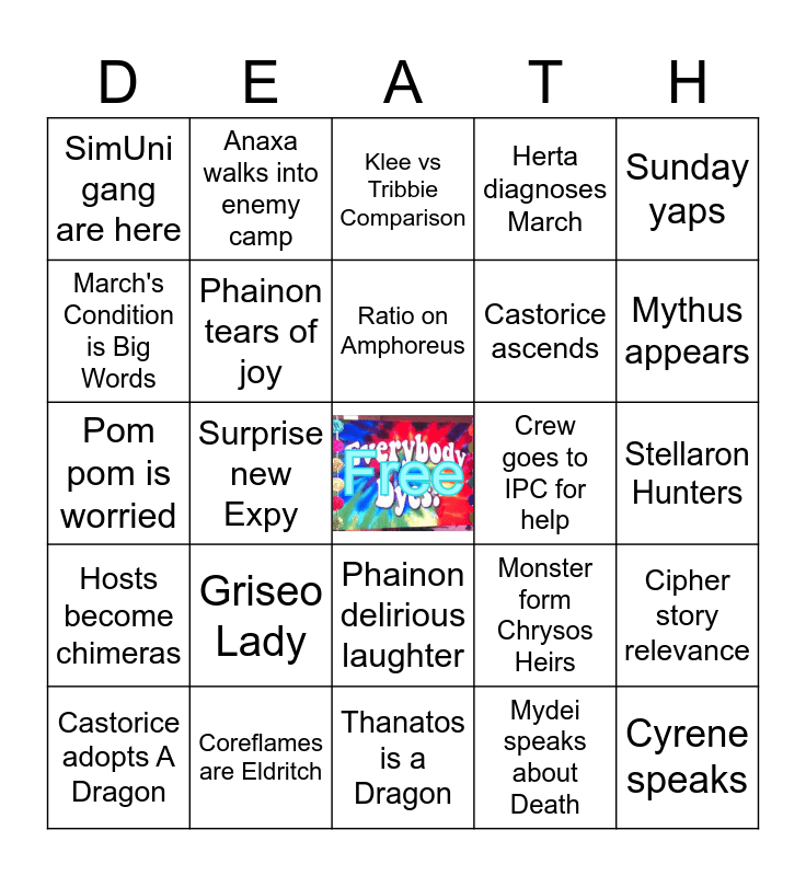 This bingo card has 1 images, a free space and 34 words: Phainon cries, Phainon smiles, Phainon tears of joy, Phainon delirious laughter, Herta diagnoses March, March's Condition is Big Words, Black Swan surprise appearance, Ratio on Amphoreus, Our Parents worry, Pom pom is worried, Sunday yaps, March rises, Aquila breaks the 4th Wall, SimUni gang are here, Crew goes to IPC for help, Mydei speaks about Death, Surprise new Expy, Hosts become chimeras, Cyrene speaks, Monster form Chrysos Heirs, Castorice adopts A Dragon, Cipher story relevance, Coreflames are Eldritch, Klee vs Tribbie Comparison, Mythus appears, 3rd Path Enigmata, Hyacine ascends, Castorice ascends, Stellaron Hunters, Da Wei, Thanatos is a Dragon, Griseo Lady, Anaxa walks into enemy camp and Cast Rice CC Technique.